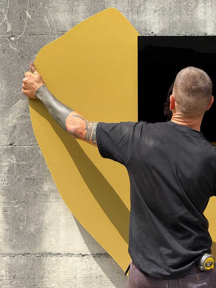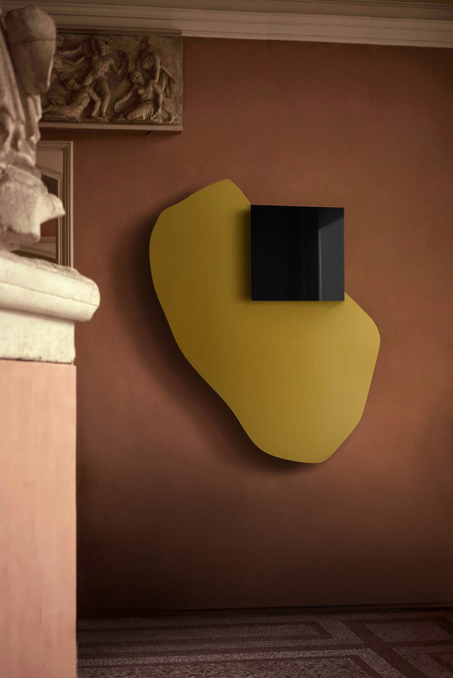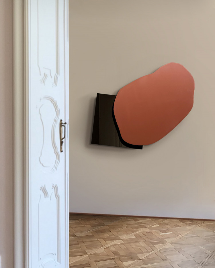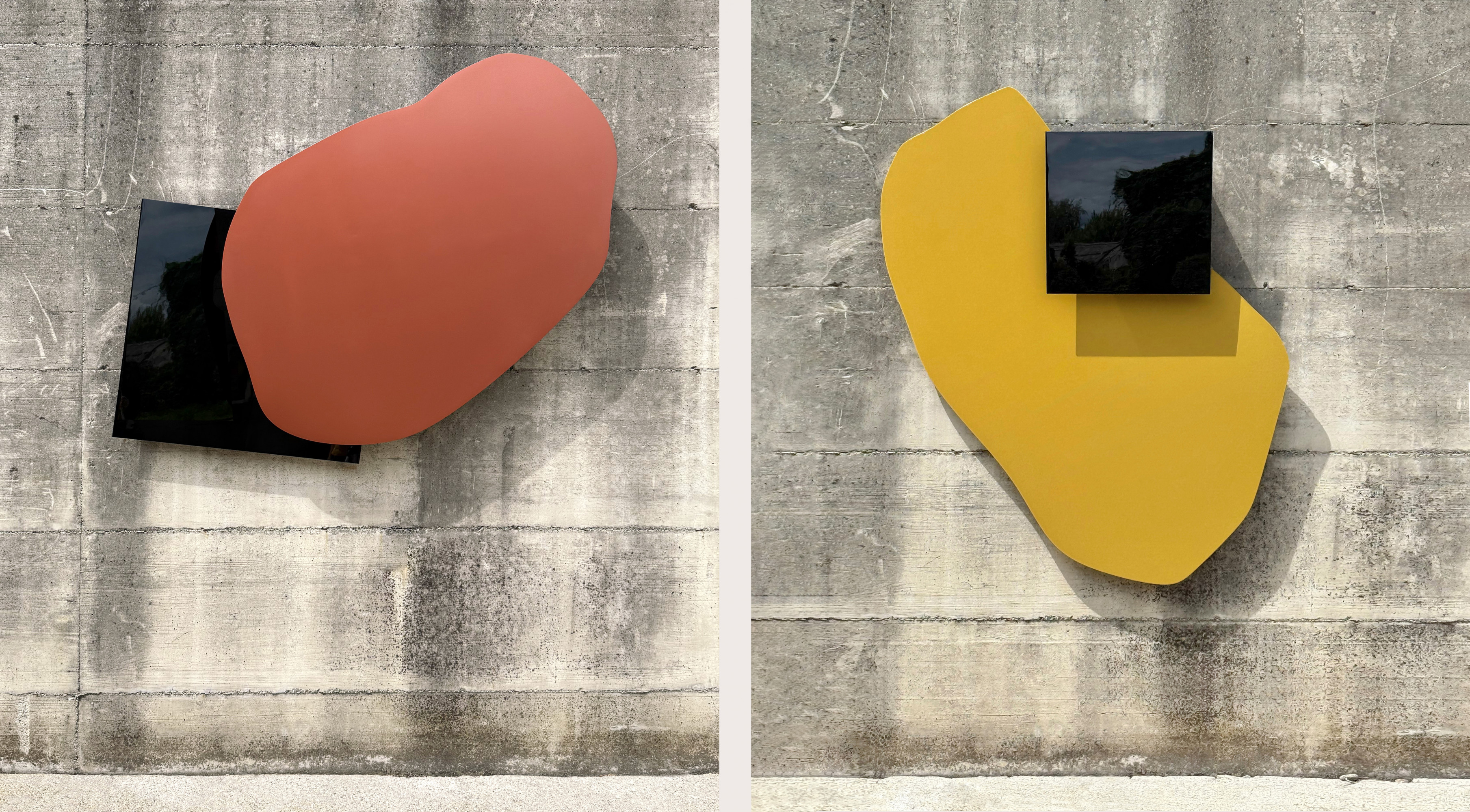 The black, reflective surfaces of Particles are dark matter, inviting a profound, inward reflection rather than a mere echo of appearances, confined to the surface of things. Around these reflective particles move free-form silhouettes vibrating with color, primordial nuclei, origins of life: the gravitational force binding these elements is perceptible, and space itself seems to bend within their field of attraction. The observer is drawn into this invisible orbit, summoned by the depth of the mirror and the energy of color and form, thus experiencing that vital spark which we rediscover in the smallest particles of existence.